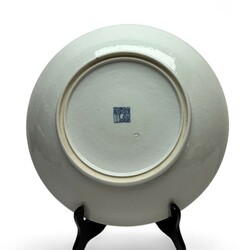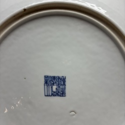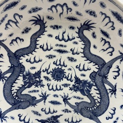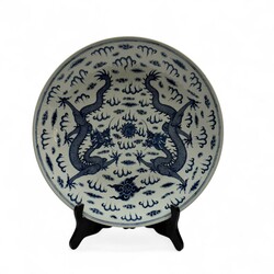 | Omschrijving | Een Chinees porseleinen schotel, blauw/wit met een decor van twee draken tussen de wolken en jagend op een vlamende parel. Gemerkt met een sealmerk op de achterzijde. 20e eeuws, maar naar een antiek voorbeeld. |