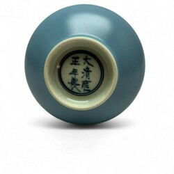 | Omschrijving | Een Chinees porseleinen monochroom pijpvaasje. Met een robin egg glazuur. Onderzijde gemerkt zes karaktertekens in onderglazuur blauw. 20e eeuws naar een vroeger voorbeeld. |