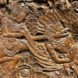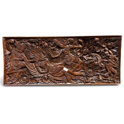 | Omschrijving | Een uit teakhout gestoken paneel met een voorstelliing van Hanuman, Vishnu en Shiva. in een landschap. 20e eeuws. |