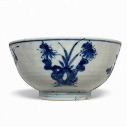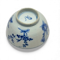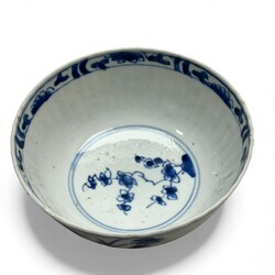 | Omschrijving | Een vroeg 18e eeuws porseleinen geribte kom. Blauw/wit met een floraal decor rondom en een bloesemtal op het plat. Gemerkt op de onderzijde. KangXi periode. |