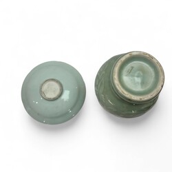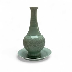 | Omschrijving | Een Chinees of Vietnamees porseleinen pijpvaas met pioenrozen decor. Hierbij een lotusvormig schoteltje met een scraffito decoratie, naar Song voorbeeld. Beide met een blauw/groen celadon glazuur. Beide 20e eeuws of ouder. |