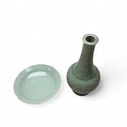 | Kavel | 765. Een porseleinen celadonvaas en een schotel. |