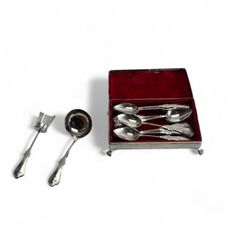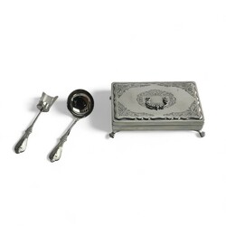 | Omschrijving | Een zilveren lepeldoosje met 12 zilveren lepeltjes, suikerschepje en roomlepel, gemerkt Niekerk, Schoonhoven |