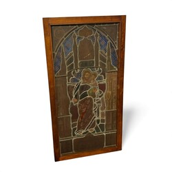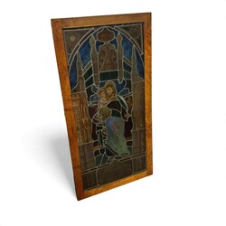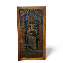 | Omschrijving | Een antiek gebrandschilderd glas-in-lood raam, ca. 1900, met voorstelling van de heilige St. Joseph, op de achtergrond een kathedraal. In eikenhouten lijst. |
