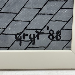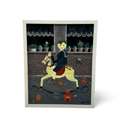 | Omschrijving | Schilderij, olieverf op board. Titel ‘jongen op hobbelpaard’, rechtsonder gesigneerd Gryt Wielinga, gedateerd 1988. |