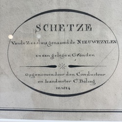 | Omschrijving | Een antieke vroeg 19e eeuwse kaart, ‘Schetze van de Zeesluis genaamd de Nieuwezylen, en aan gelegen Gronden, Opgenomen door den Conducteur en Landmeter C. Boling in 1814’. Handgetekend (inkt), ingelijst. |