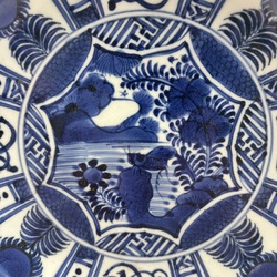 | Omschrijving | Een antiek Japans Arita porseleinen bordje, Edo periode, ca. 1700. Met blauw-wit decor in kraak stijl, met centraal een landschapsdecor met insect, de randen met medaillons met kostbaarheden en zonnebloemen. |