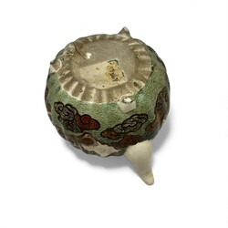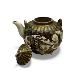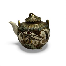 | Omschrijving | Een laat 19e eeuws Japans Satsuma aardewerken trekpotje. In de vorm van een pompoen. Rondom verguld en beschilderd met een vogel en twee krijgsheren. Meiji periode. |