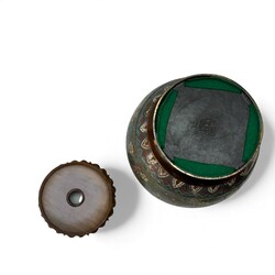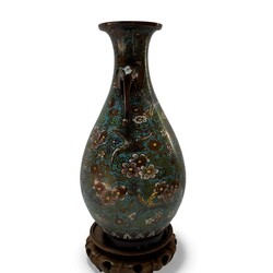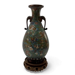 | Omschrijving | Een vroeg 20e eeuwse Japanse champlevé tweeorenvaas. Rijk versierd met vogels tussen bloemen en twee grepen in de vorm van olifantenkoppen. Aan de onderzijde gemerkt met zegelmerk. Op houten sokkel. |