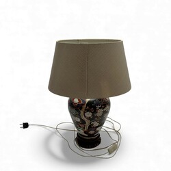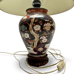 | Omschrijving | Een antieke 18e of 19e eeuwse Japanse porseleinen vaas, met decor van bloemen en kraanvogels. Vermaakt tot schemerlamp. Op gestoken houten onderzetter. |