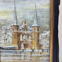 | Omschrijving | Schilderij, olieverf op doek. Gezicht op de Waterpoort, Sneek. Rechtsonder gemonogrammeerd 'JV' = Johan Veenstra, gedateerd 1987. |