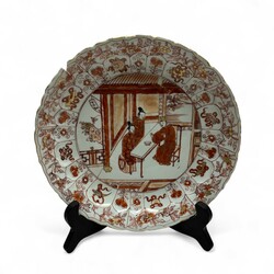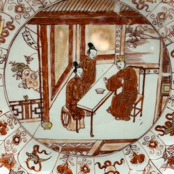 | Omschrijving | Een KangXi periode Chinees porseleinen schotel. Melk en bloed met een florale en kostbaarheden beschilderde rand en met een voorstelling van scolar met twee studenten in een interieur. Ca 1700. |