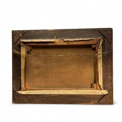 | Conditie | Lijst flink beschadigd, doek vervuild en vergeeld, verpoetste plekken, één stootplek (staat licht bol) |