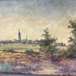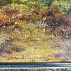 | Omschrijving | Schilderij, olieverf op doek. Landschap met stad op de achtergrond, vermoedelijk Hilversum (met Rooms-Katholieke Kerk). Middenonder gesigneerd Lion Schulman (Hilversum 1851 - Auschwitz 1943), gedateerd 1923. In ornamentenlijst. |