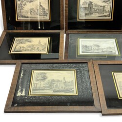 | Omschrijving | Lot van acht 18e eeuwse kopergravures van poorten te Leiden: ‘Koe Poort’, ‘de Hogewoertsche Poort’, ‘De Zyl Poort’, ‘de Heere Poort’, ‘de Mare Poort’, ‘de Rhynburgsche Poort’, ‘de Morsch poort’, en ‘de Witte Poort te Leyden’. Gravures door Abraham Delfos, na een tekening van Jan de Beijer, 1762. |