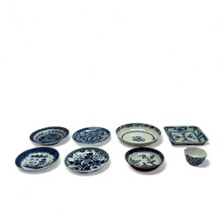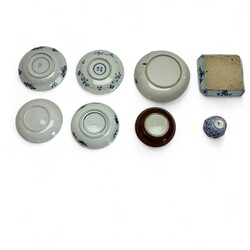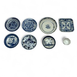 | Omschrijving | Lot Chinees porselein, bestaande uit zes schoteltjes, 1 kopje en een pattipan. Alles blauw/wit met diverse florale en krab en baars en lijzen decors. 18e en 19e eeuws. |