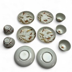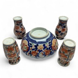 | Omschrijving | Lot divers Japans imari: een 19e eeuwse boerenimari kom, twee paar 19e eeuwse vaasjes en een set van zes schotels en vijf kopjes, 18e eeuw, Edo periode. |
