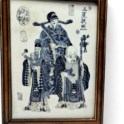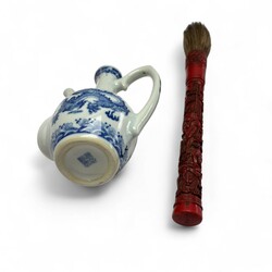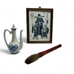 | Omschrijving | Lot divers Chinees: een 20e eeuwse blauw-wit kannetje met drakendecor, een kalligrafie kwast en een porseleinen plaquette met diverse figuren. |