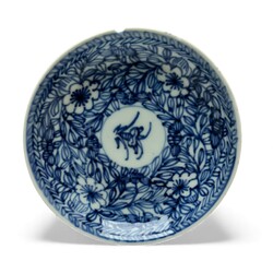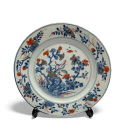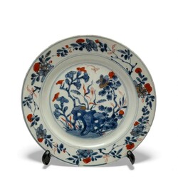 | Omschrijving | Lot van twee 18e eeuwse Chinees porseleinen imari borden, Qianlong periode (1735-1796), met onderglazuur blauw en bovenglazuur rood en goud decor van bloemen, rotsen en vlinders. Met daarbij drie kopjes en twee schotels, tevens Qianlong periode (1735-1796), met onderglazuur blauw floraal decor. |
