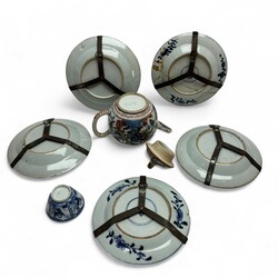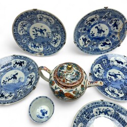| Omschrijving | Lot divers Chinees porselein: een antieke 18e eeuwse theepot, Qianlong periode (1735-1796), met Amsterdams Bont decor van papegaaien. Met daarbij vijf 18e eeuwse bordjes, tevens Qianlong periode, met decor van zotjes met bloem en één kopje met identiek decor. |