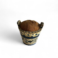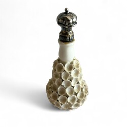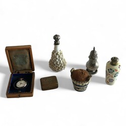 | Omschrijving | Lot diversen: een porseleinen parfumflacon met messing montuur, een 19e eeuws speldenkussen in gekuipt houten emmertje, koperen doosje, 19e eeuws porseleinen parfumflacon met decor van schelpen en zilveren hals en dop, zilveren strooibus bekroond met adelaar, gemerkt met pseudokeuren en een derde gehalte (800/1000) zilveren dameszakhorloge, ca. 1900, in dooesje: |