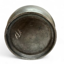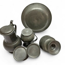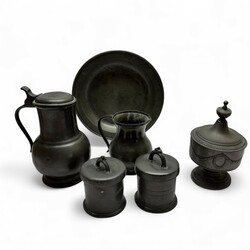 | Omschrijving | Lot divers tin: een antieke 19e of 20e eeuwse schenkkan, gemerkt Meeuws & Zoon Den Haag, grote kan met deksel, gemerkt ‘HM’, twee antieke tinnen boterbussen, één aan de onderzijde gegraveerd met initialen ‘HS’ en onduidelijk gemerkt aan de onderzijde van de deksel (eindigend op ‘Ningen’), andere aan de onderzijde gemerkt met ‘HL’ boven roosje, vermoedelijk Hendrik Lubach (1804-1842) te Leeuwarden, een tabakspot in Seize stijl, gemerkt ‘W’ boven roosje aan de onderzijde van de deksel, en een antieke schotel, gemerkt ‘FVDB’ en ‘Bogaert’ = Frans van den Bogaert, Den Bosch. |