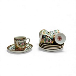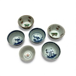 | Omschrijving | Lot divers porselein: Een Engels 18e eeuws porseleinen theebusje met transferdecor, zgn. ‘Fence pattern’, door Caughley, vijf 20e eeuwse Kantonese kop en schotels, gemerkt ‘Hand-Painted Decoration Made in China’, drie 18e eeuwse Chinees porseleinen kopjes met decor van zotjes, één 18e eeuws Japans imari kopje met floraal decor en twee 18e eeuwse Chinees porseleinen kopjes, Famille verte, Kangxi periode (1664-1722), gelijmd. |