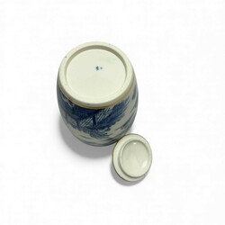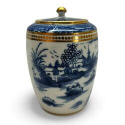 | Conditie | Deksel theebus gelijmd, verte kopjes gelijmd, één blauw-wit kopje met chips en haarlijnen, |