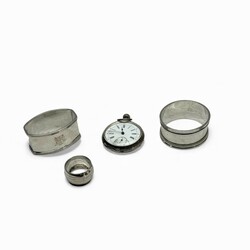 | Omschrijving | Lot diversen, waaronder drie 20e eeuwse tweede gehalte (835/1000) zilveren servetringen, diverse jaartallen en modellen, een antiek zakhorloge, ca. 1900, in derde gehalte (800/1000) zilveren kast, en een metalen klompje, gemerkt, vermoedelijk een relatiegeschenk. |