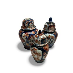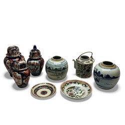 | Omschrijving | Een lot Chinees en Japans porselein, bestaande ui drie Imari deskselvazen, twee gemberpotten, twee famille rose schotels en een famille verte theepot, deksel mist. |
