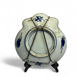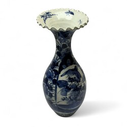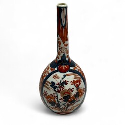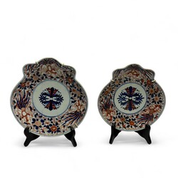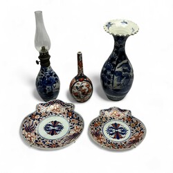 | Omschrijving | Lot met divers Japans Imari en boeren Imari. Bestaande uit een kraagvaas, pijpvaas, twee waaijervormige schotels en een olielamp . Vroeg 20e eeuws. |