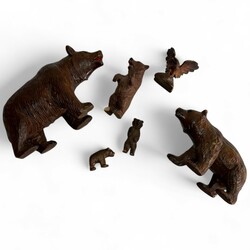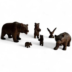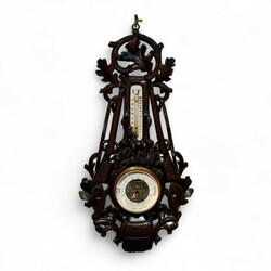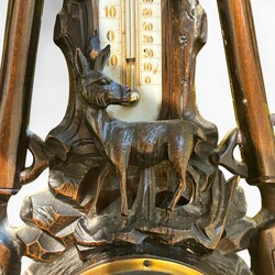 | Omschrijving | Lot Schwarzwalder (7x): een antieke thermometer en barometer in gestoken houten kast, met voorstelling van rocailles, bladeren, een hert, twee geweren aan weerszijden en een jagerstas aan de onderkant. Met daarbij vier Schwarzwalder figuren, vier beren en een roofvogel. |