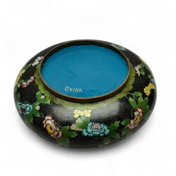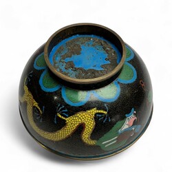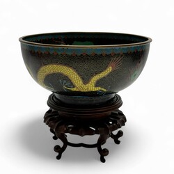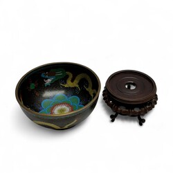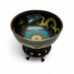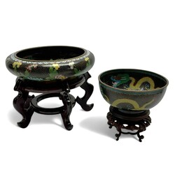 | Omschrijving | Lot van twee 20e eeuwse Chinese cloisonné kommen, één vroeg 20e eeuws met decor van draken die een brandende parel achtervolgen en één midden 20e eeuw met decor van bloemen, gemerkt 'China'. Beiden op houten sokkels. |