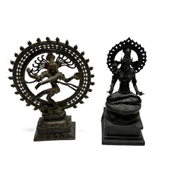 | Omschrijving | Lot van twee 20e eeuwse Indiase bronzen beelden, één met voorstelling van Shiva als Nataraja, dansend in een vlammencirkel. En één met voorstelling van een zittende Boeddha, in meditatiehouding, op vierkante voet. |
