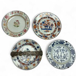 | Kavel | 748. Lot van vier 18e eeuwse Chinese borden, één met zilveren beugel |