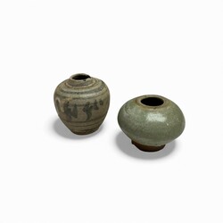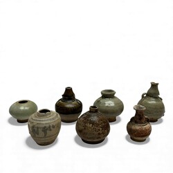 | Omschrijving | Lot van zeven stuks Thaise Sawankhalok aardewerk. Bestaande uit miniatuur kruikjes en potjes, enkele met oortjes. In bruine en celadon glazuren. 1 beschilderd. 15e eeuws. |