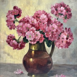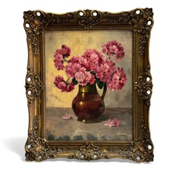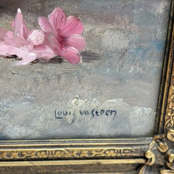 | Omschrijving | Schilderij, olieverf op doek. Bloemstilleven met roze geraniums in rood- en geelkoperen kannetje. Rechtsonder gesigneerd Louis van der Steen (Den Haag 1891-1954). In vergulde Heijdenrijk ornamentenlijst. |