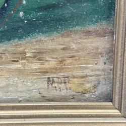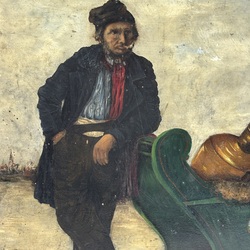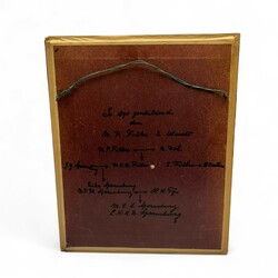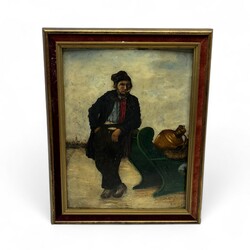 | Omschrijving | Een schilderij olieverf op paneel, voorstellende een pijprokende man bij slee. Onduidelijk gesigneerd op de voorzijde en met op de achterzijde complete stamboom van de aschilder M.P. Filbri. Gelijst. |