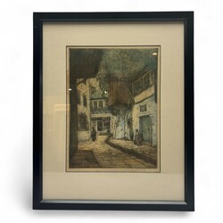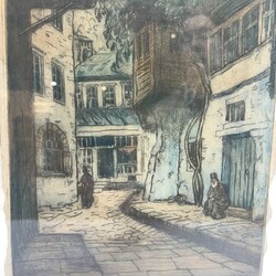 | Omschrijving | Kleurenets op papier, voorstelling van een straatje met twee (Joodse?) mannen. Rechtsonder gesigneerd Martin van Waning (Den Haag 1889 – Dokkum 1972). |