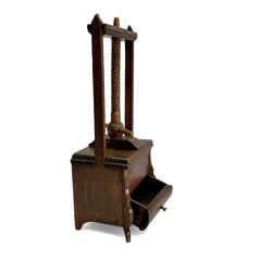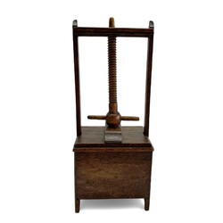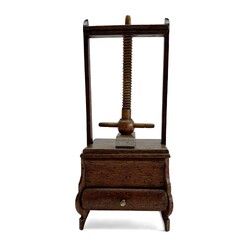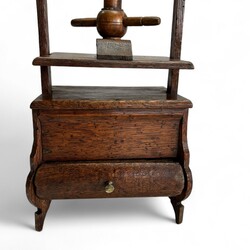 | Omschrijving | Een antieke 19e eeuwse miniatuur eikenhouten linnenpers met lade. |
