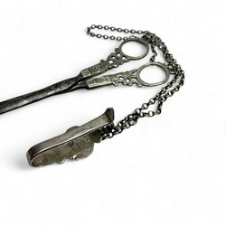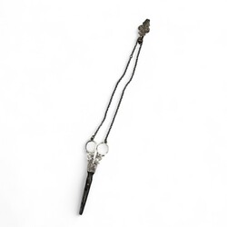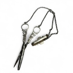 Schaar met zilveren grepen, jasseronketting, rokhaak.