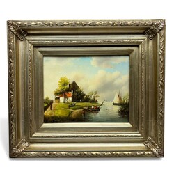 | Omschrijving | Schilderij, olieverf op paneel. Hollands landschap met vissers en huisje bij het water. Linksonder gesigneerd R. v.d. Burg, Hollandse School 20e eeuw. In zilverkleurige lijst. |