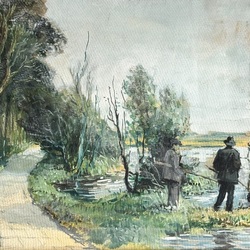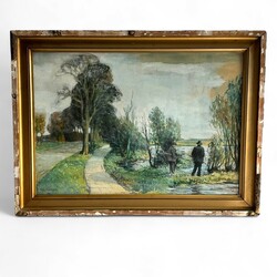 | Omschrijving | Gouache op papier, voorstelling van de Oude Groningerstraatweg met twee vissers bij de Grote Wielen, Leeuwarden. Linksonder gesigneerd Roelof Klein (Leeuwarden 1915 - 1981), gedateerd 1935. |