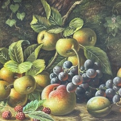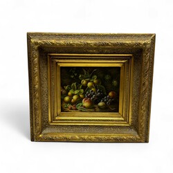 | Omschrijving | Een schilderij olieverf op paneel. Stilleven met divers fruit, bestaande uit druiven, appels en frambozen. Niet gesigneerd. In vergulde lijst. 20e eeuws |