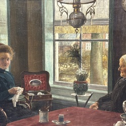 | Omschrijving | Schilderij olieverf op doek. Twee dames, moeder en handwerkende dochter in interieur, ca 1900. Niet gesigneerd. Gelijst. |