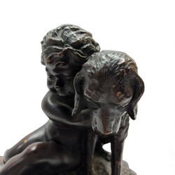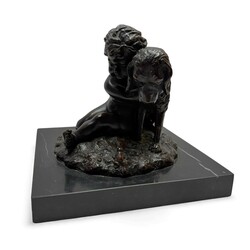 | Omschrijving | Een 20e eeuws sculptuur op marmeren sokkel, voorstelling van een putti met een hond. Gesigneerd ‘J. Daste’ op de voet. |