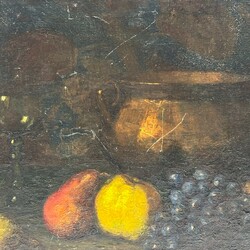 | Omschrijving | Schilderij olieverf marouflé. Stilleven met fruit, koperen ketel en antiek glas. Gesigneerd linksboven A. van Houten (= Alida van Houten (1886-1860)). Nichtje van Sientje Mesdag van Houten. Niet gelijst. |