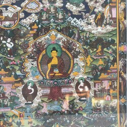 | Omschrijving | Een 20e eeuwse thangka, op textiel geschilderd, met voorstelling van een Boeddha in het midden, omringd door diverse figuren. Herkomst Tibet of Nepal. |