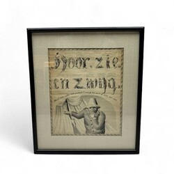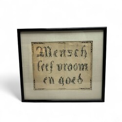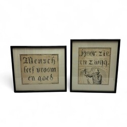 | Omschrijving | Een paar laat 18e eeuwse gravures met spreuken. "Hoor zie en zwijg en Mensch leeft vroom en goed en Wat of daar achter toch geschiedt? Weet jij het ook, ik weet het niet". Letters in de vorm van karikaturen en een pierrot. Ca 1790. Beide gelijst. |