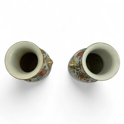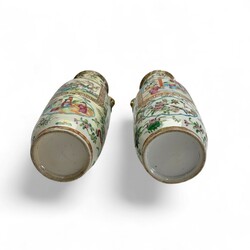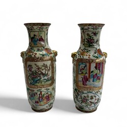 | Omschrijving | Twee Chinese Canton-vazen, 19e eeuw, rijk beschilderd in famille rose palet met figuren, vogels en bloemen. Met gouden appliqué-handvatten. |